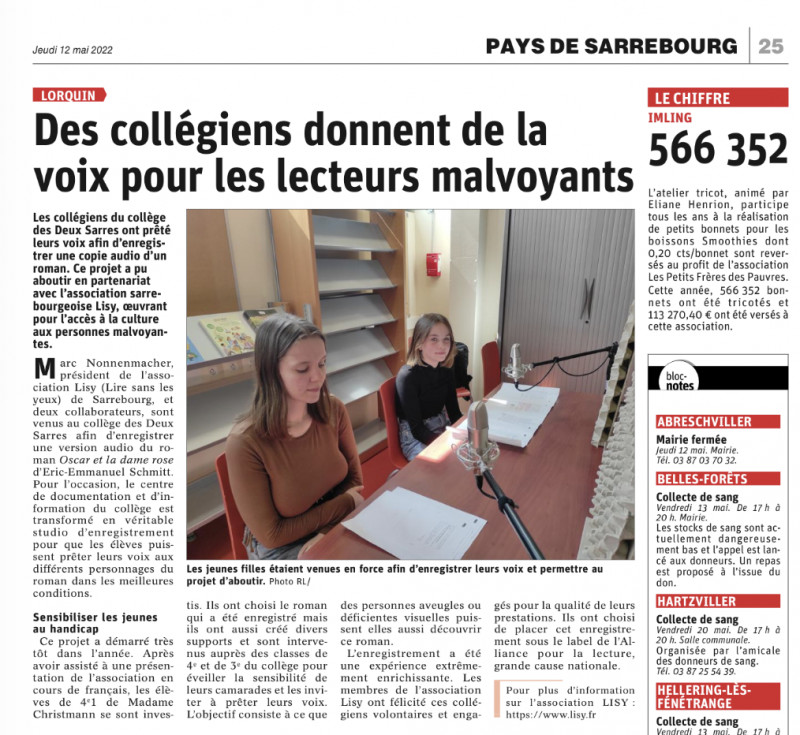 Le livre Oscar et la dame rose de Eric Emmanuel Schmitt fera l'objet d'une prochaine production en version audio par les éléèves du collège de Lorquin en Moselle dans le cadre de l'alliance pour la lecture, grande cause nationale
